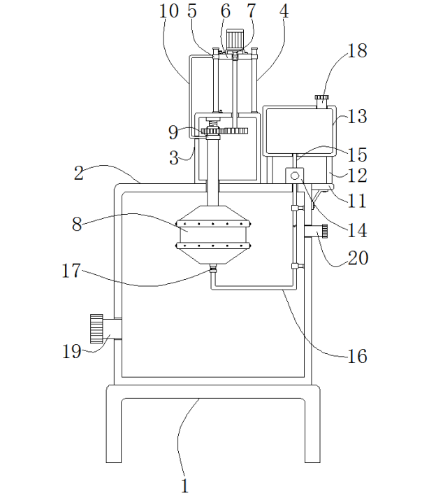 當液體脫硫劑進入U形出液管16的內部后,再通過旋轉接頭17將液體脫硫劑輸送至環形噴管8的內部并通過環形噴管8將液體脫硫劑噴灑至箱體2的內部,當液體脫硫劑噴灑至箱體2的內部后通過進氣管19將氣體送至箱體2的內部,當箱體2內部的氣體與液體脫硫劑混合后通過出氣管20排出即可。