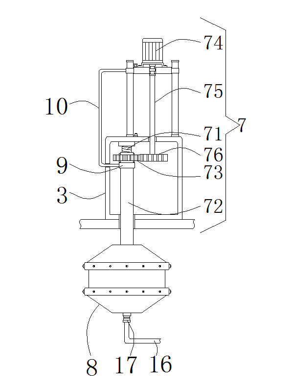 工作原理:操作者首先將液體的脫硫劑通過注液管18注入儲料箱13的內部,當儲料箱13的內部加滿液脫硫劑后,再啟動電機74帶動轉動桿75進行轉動,當轉動桿75轉動時帶動第二齒輪76在防護箱3的內部進行轉動,當第二齒輪76轉動時帶動第一齒輪73進行轉動,當第一齒輪73轉動時帶動內螺紋套管72在螺紋桿71的表面進行轉動,防護箱3的內部進行轉動,當內螺紋套管72轉動時帶動環形噴管8在箱體2的內部進行升降和轉動,當內螺紋套管72向箱體2的內部移動時通過軸承9帶動U形連接桿10向防護箱3的一側移動,當U形連接桿10的移動時通過滑塊5和連接板6帶動電機74在滑桿4的表面進行移動,當環形噴管8轉動時啟動水泵14將儲料箱13內部的液體脫硫劑通過進液管15將液體脫硫劑送入U形出液管16。